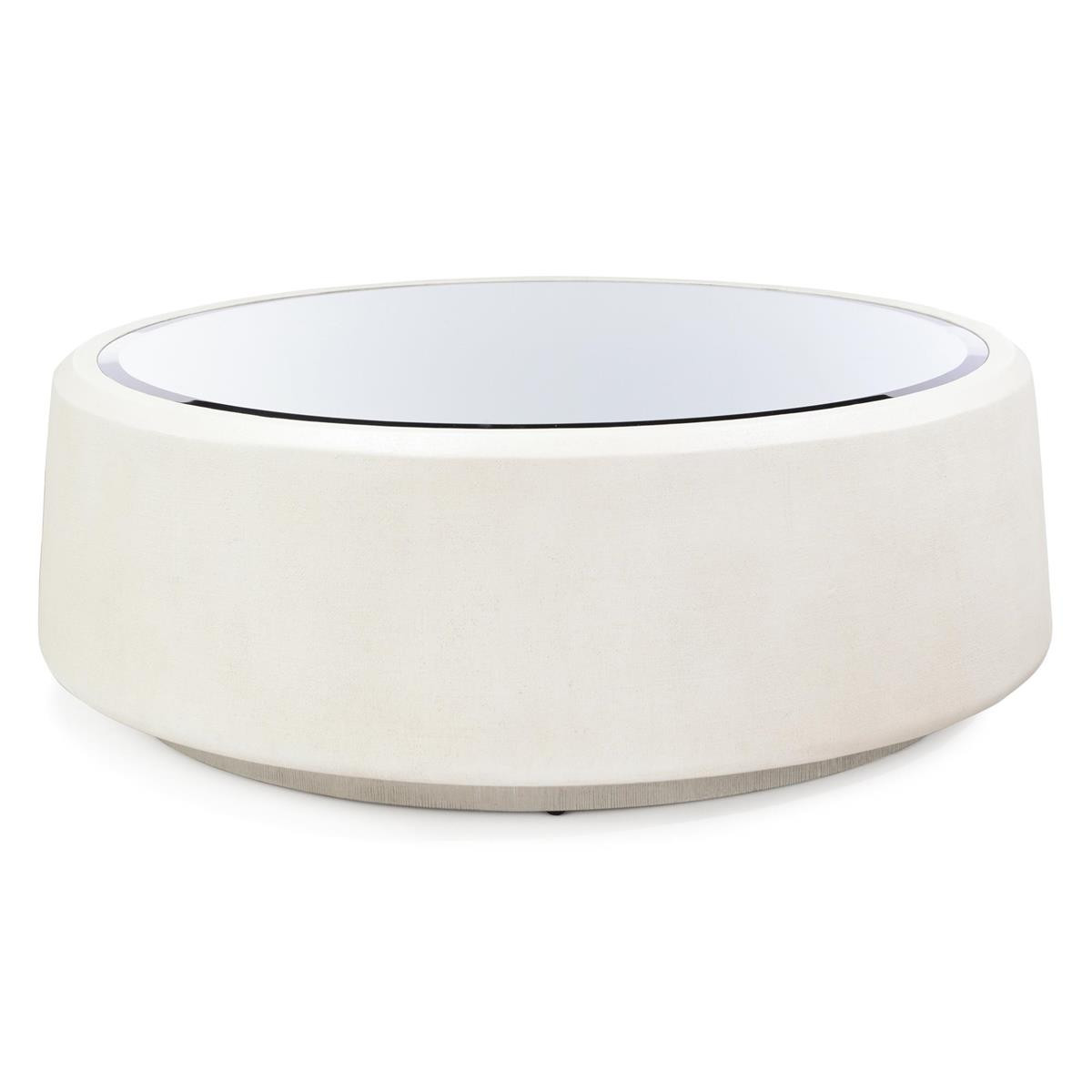Enjoy the Looking Glass Cocktail Table in your home today! The modern, innovative design of the Looking Glass Cocktail Table effortlessly draws eyes and sparks conversation. A body of beech wood showcasing delicate curvature is enveloped in burlap fabric and given an Opal Linen finish, resulting in a beautiful white hue. The piece stands atop a textural base in a stunning Cascade finish, creating a gorgeous silver accent. A beveled mirror acts as the tabletop, pulling the piece together and instilling it with an excess of visual interest that greatly enhances an interior space.