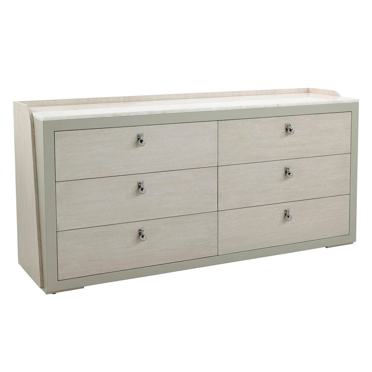 Enjoy the Metro Six-Drawer Chest in your home today! The Metro Chest is a sleek, contemporary piece that instills an atmosphere of pristine modernity to an interior space. A sturdy oak wood frame featuring an angular profile is adorned in a Grey Washed finish, giving it a delicate cream color that seamlessly blends with a variety of spaces. Each of the six drawers feature lining in suede and leather, soft closing drawer runners, as well as ball handles of Polished Stainless Steel that provide beautiful contrast to the tabletop of white onyx marble.