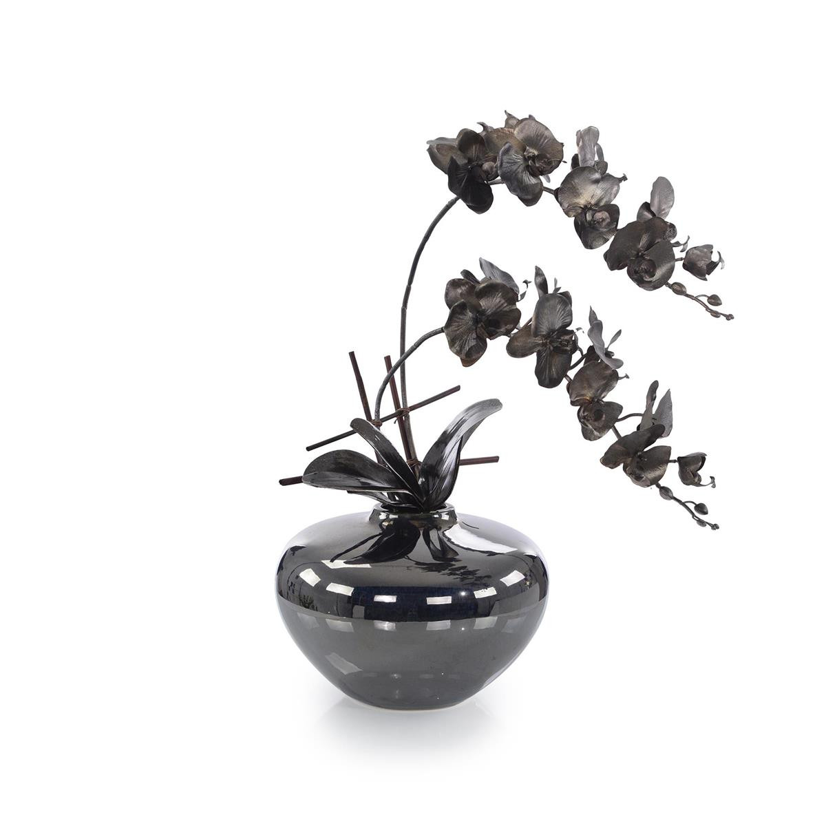 Enjoy the Midnight Delight in your home today! Platinum phalaenopsis orchids and foliage are in an glazed ebony vase.