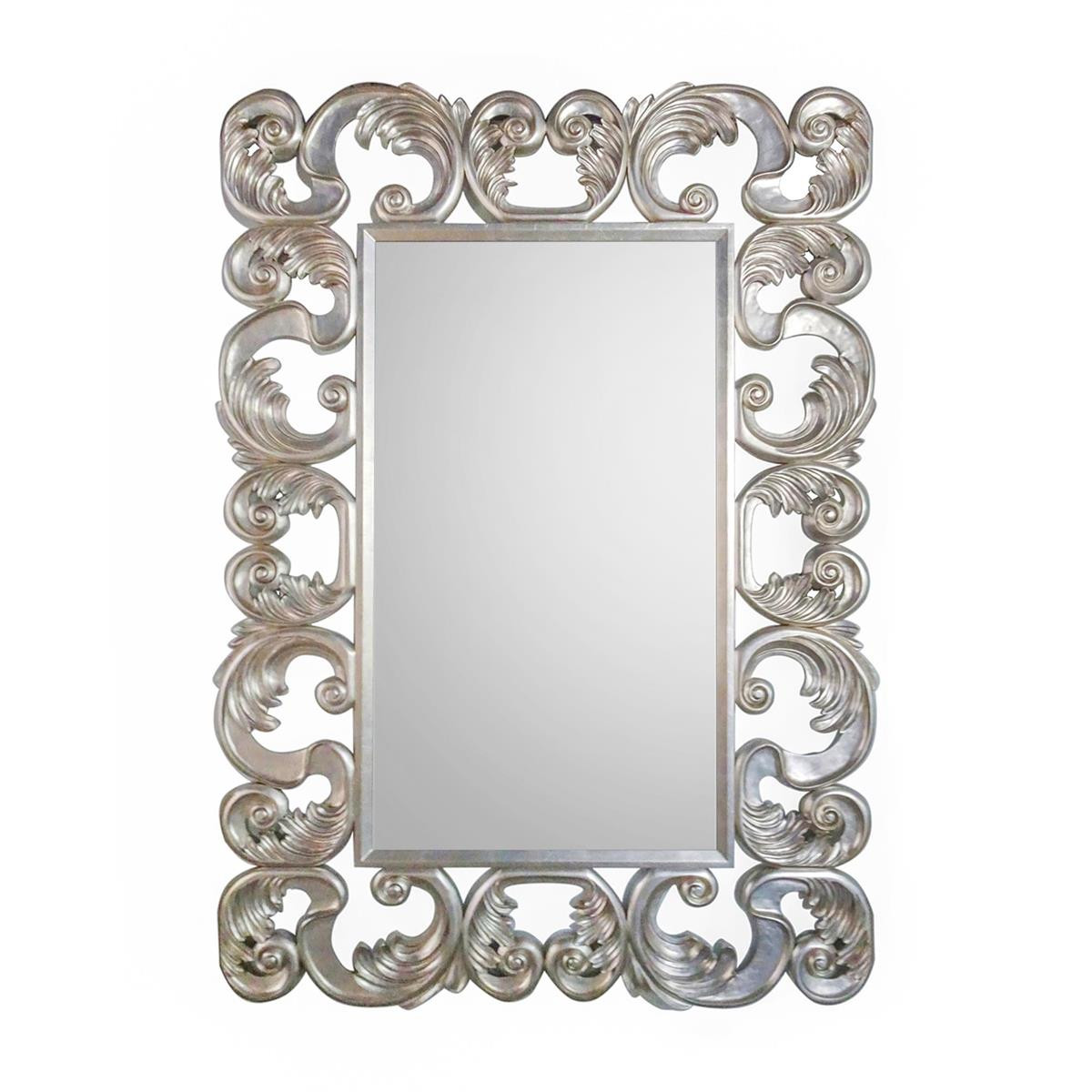 Enjoy the Montelena Mirror in your home today! This statement mirror has an open acanthus leaf frame around a central, modern beveled mirror. The frame is finished in a transitional silver. This mirror is designed for portrait or landscape orientation.