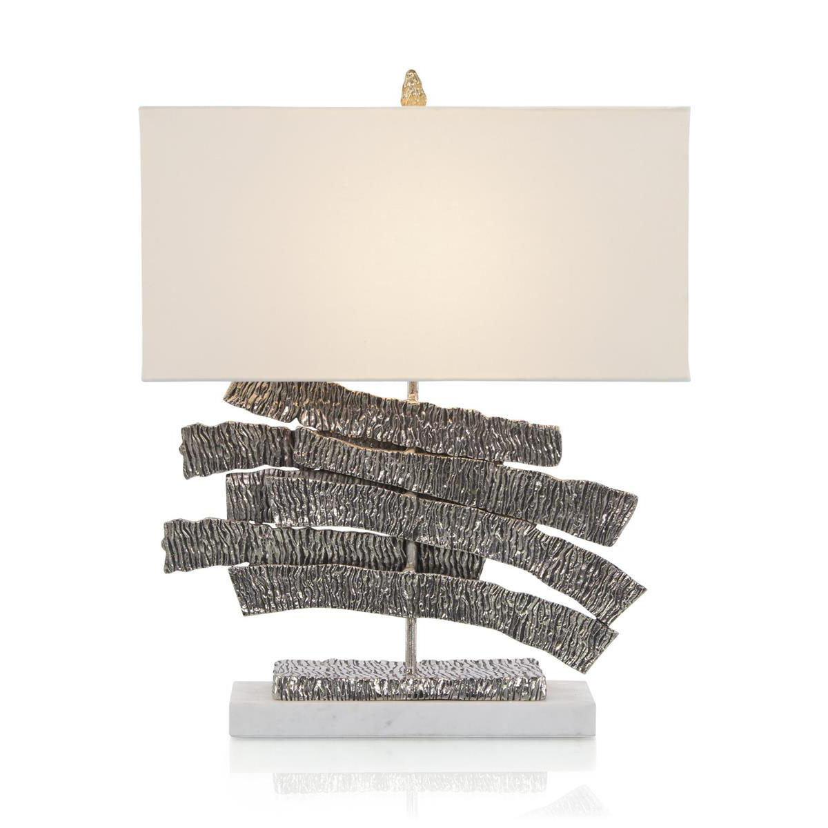 Enjoy the Nickel Crinkle Swoosh Table Lamp in your home today! A contemporary table lamp in antique nickel with a heavy crinkle pattern creates a swoosh form. This energetic lamp sits on a white marble base. Shade: (24" X 10") X (24" X 10") X 12", Oat Man-Made Linen outside and White Cotton inside, Rectangular. 3 Way, 150 Watt Max, Type A Bulb, 10.5" Nickel Harp, Turnkey. Disclaimer: This item is made by hand using artisanal primitive bending and welding techniques. The imperfections in the seams and body are reflections of the piece's handmade nature and are part of its innate beauty. No two will be identical.