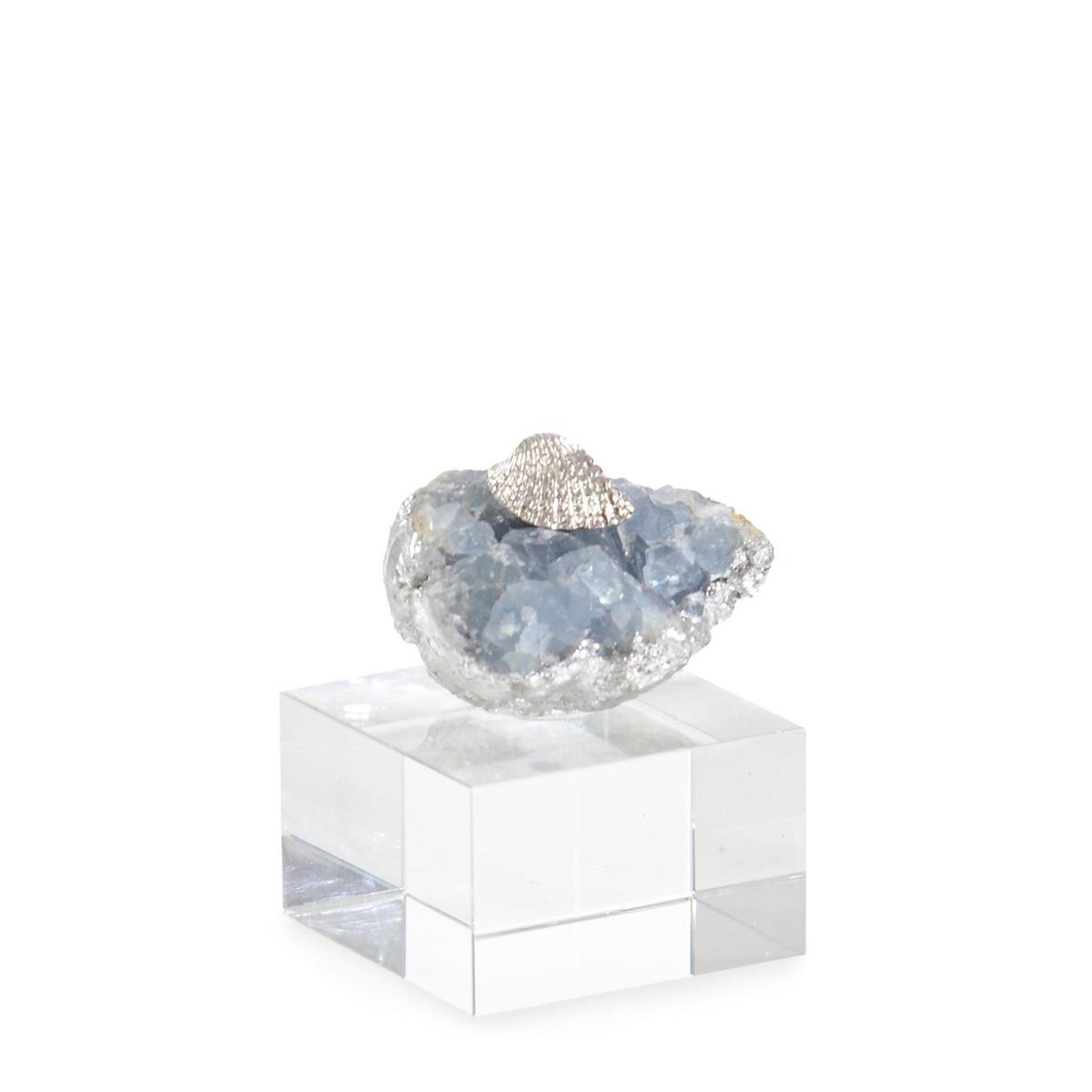Enjoy the Ocean Floor Sculpture On Crystal Base Iii in your home today! A celebration of the oceans natural beauty, the Ocean Floor Sculpture on Crystal Base features a rugged blue stone that nests within a bed of brass in a nickel finish. A small conch shell rests gently on top of the stone, with a large block of clear acrylic introducing transparent hues and smooth lines to the organically shaped piece.