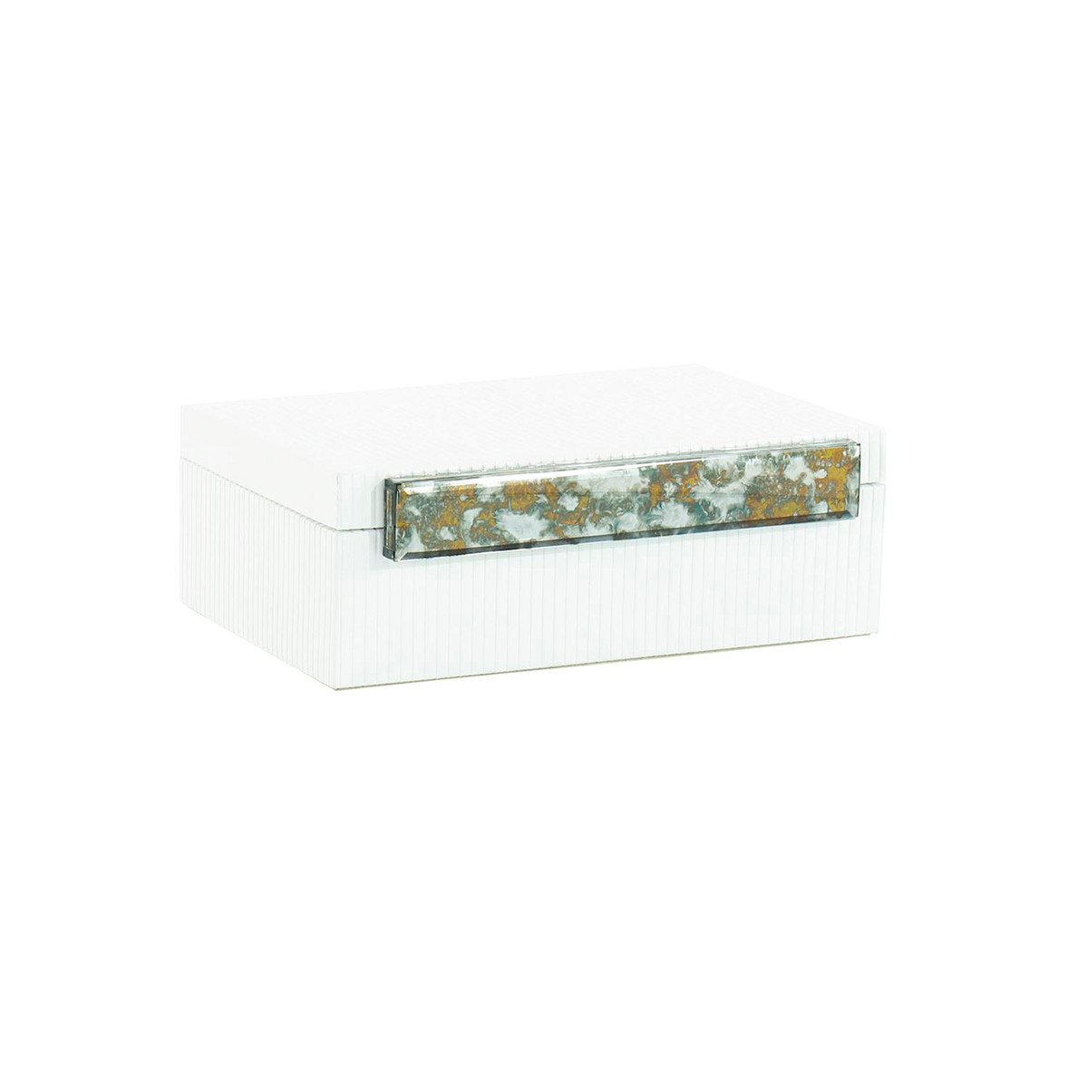 Enjoy the Olympia Box - Small in your home today! The Olympia Box is a stunning accent piece showcasing a striped look with pristine white tones. A mirrored glass handle is adorned in an antiqued finish that displays gorgeous, blended tones of white and gold.