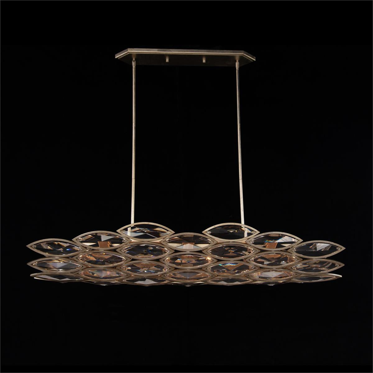 Enjoy the Petaline Six-Light Horizontal Chandelier in your home today! The Petaline Horizontal Chandelier is a stylish, contemporary take on stunning natural motifs. Suspended from an ornate steel frame in a Champagne Silver finish, the piece evokes the look of elegant flower petals through gorgeous cuts of clear crystal. This sophisticated statement piece features six lights.