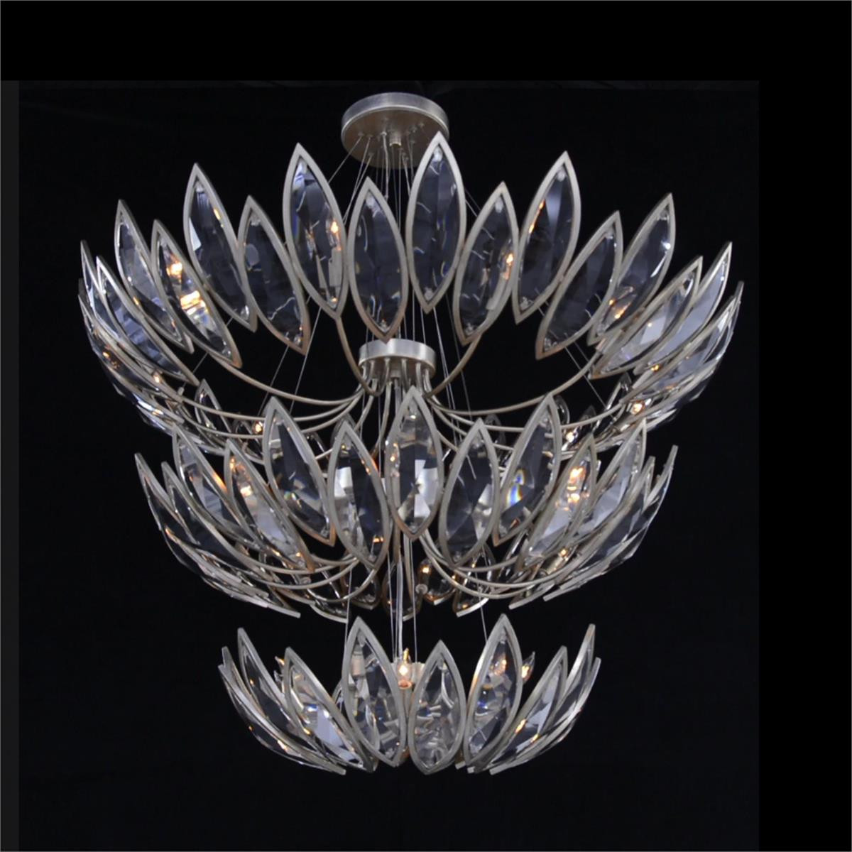 Enjoy the Petaline Twenty-Seven-Light Three-Tier Chandelier in your home today! The Petaline Chandelier is a stylish, contemporary take on stunning natural motifs. Suspended from an ornate steel frame in a Champagne Silver finish, the piece evokes the look of elegant flower petals through gorgeous cuts of clear crystal. This sophisticated statement piece features 27 lights across three tiers.