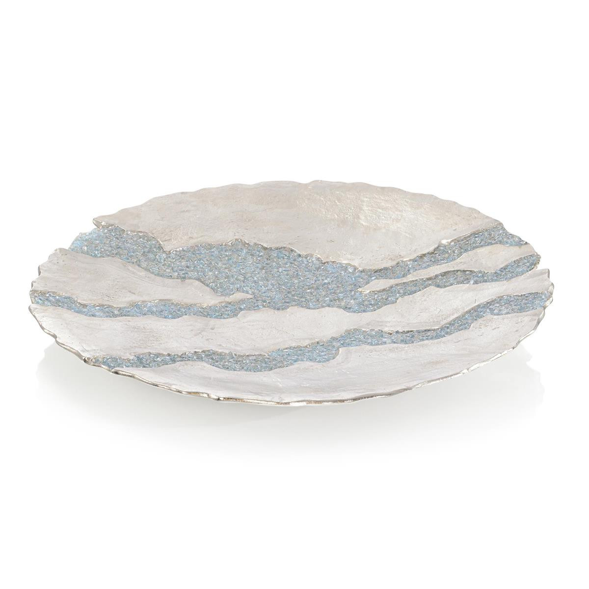 Enjoy the Rift Charger - Nickel in your home today! The Rift Charger is a gorgeous accent plate that has been lovingly crafted from enameled metal in a nickel finish. A series of rugged fracture lines, made from blue shards of crushed glass, span the width of the piece to stunning results.