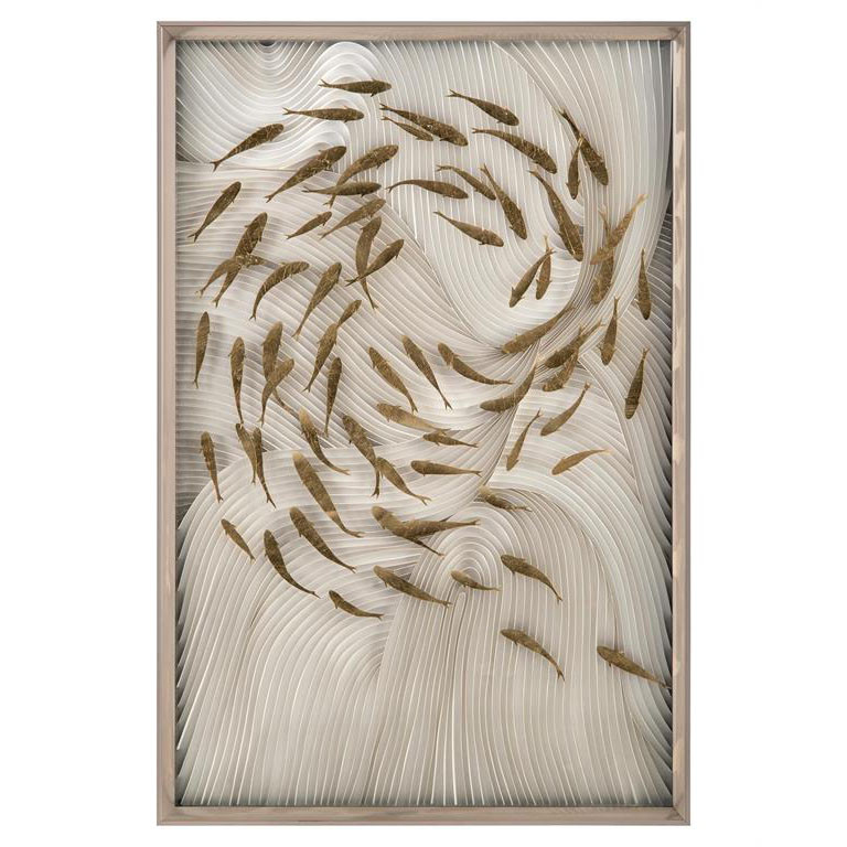 Enjoy the Robat's School of Fish in your home today! A school of golden fish circle elegantly across a textural white backdrop. Each unique creation is secured under plexiglass with a crisp metallic frame.