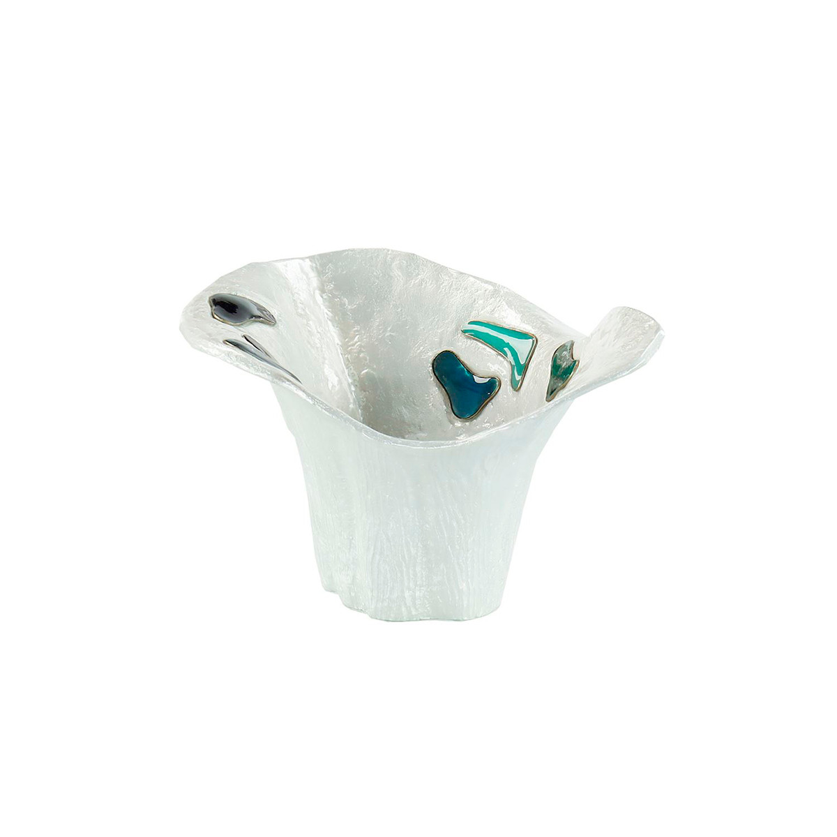 Enjoy the Sana Bowl in your home today! The Sana Bowl is a stunning home accent that infuses a space with gorgeous abstract forms. Crafted from aluminum with an enamel coating, the piece features a Pearl White finish for a colorful sheen. Small cuts of smoothed glass in a variety of colors adorn the rim, traced by slim brass accents.