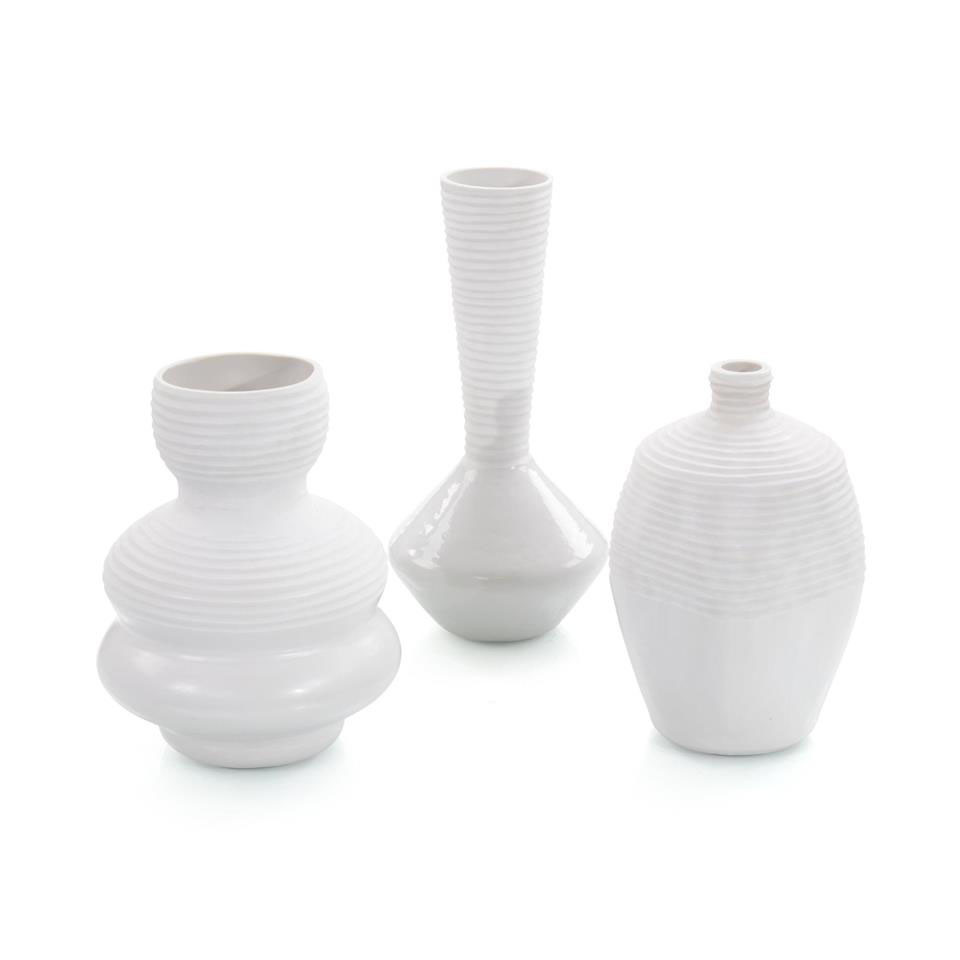 Enjoy the Set of Three White Chiseled Vases in your home today! With a contemporary nod to the classic Greek style, this set of three vases with chiseled bands in white glass is striking. Disclaimer: With glass, variations in size, shape, and color may occur.