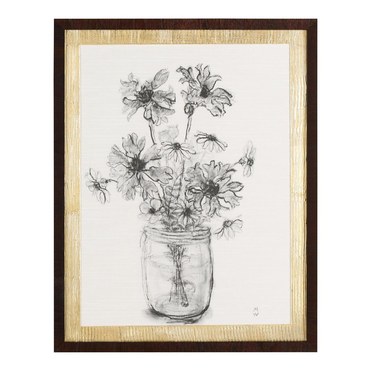 Enjoy the Shine By Manny Woodard in your home today! Shine by artist Manny Woodard is printed on silk in black and white, depicting a mason jar with delicate flowers. Hand-applied gold leaf texturing imbues the piece with ornate tones and textural depth. The artwork is displayed under glass within a mahogany gallery frame.