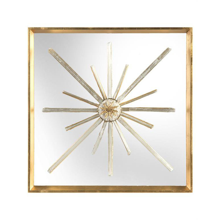 Enjoy the Star-Crossed Circle in your home today! Elegant streams of selenite enhanced with gold leaf radiate from a circle quartz embellishment with an intricately cast brass flower, creating desirability to this piece. The mirrored background and gold frame add to the brilliance of this star.