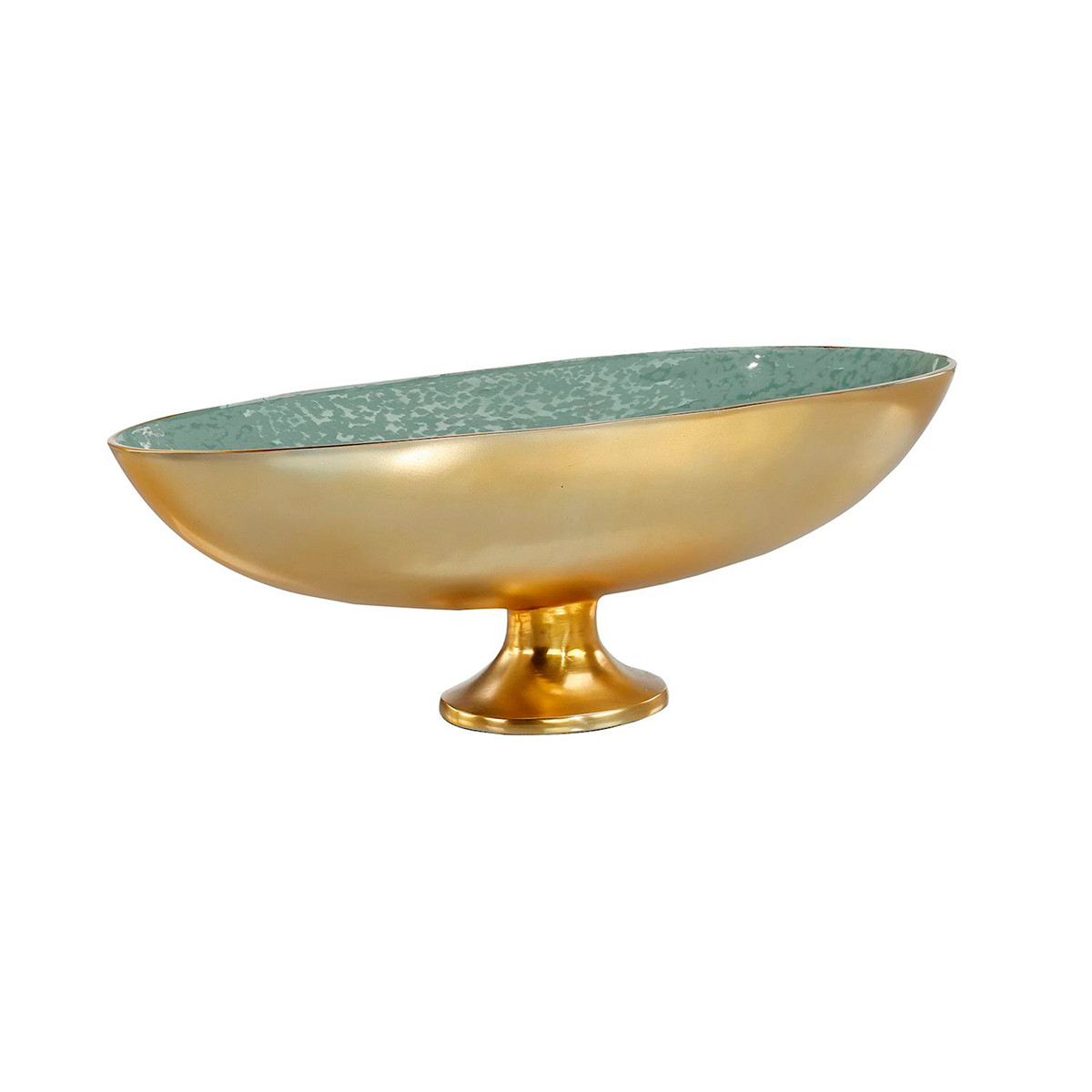 Enjoy the Timberland Bowl in your home today! The Timberland Bowl is a stunning decorative accent with a gorgeous canoe shape that rests atop a small, rounded base. This aluminum bowl is adorned in a gold finish around the exterior, beautifully matched by the interior in a glossy mint green tone. This classic blend of gold and green tones communicates a dignified, sophisticated look.
