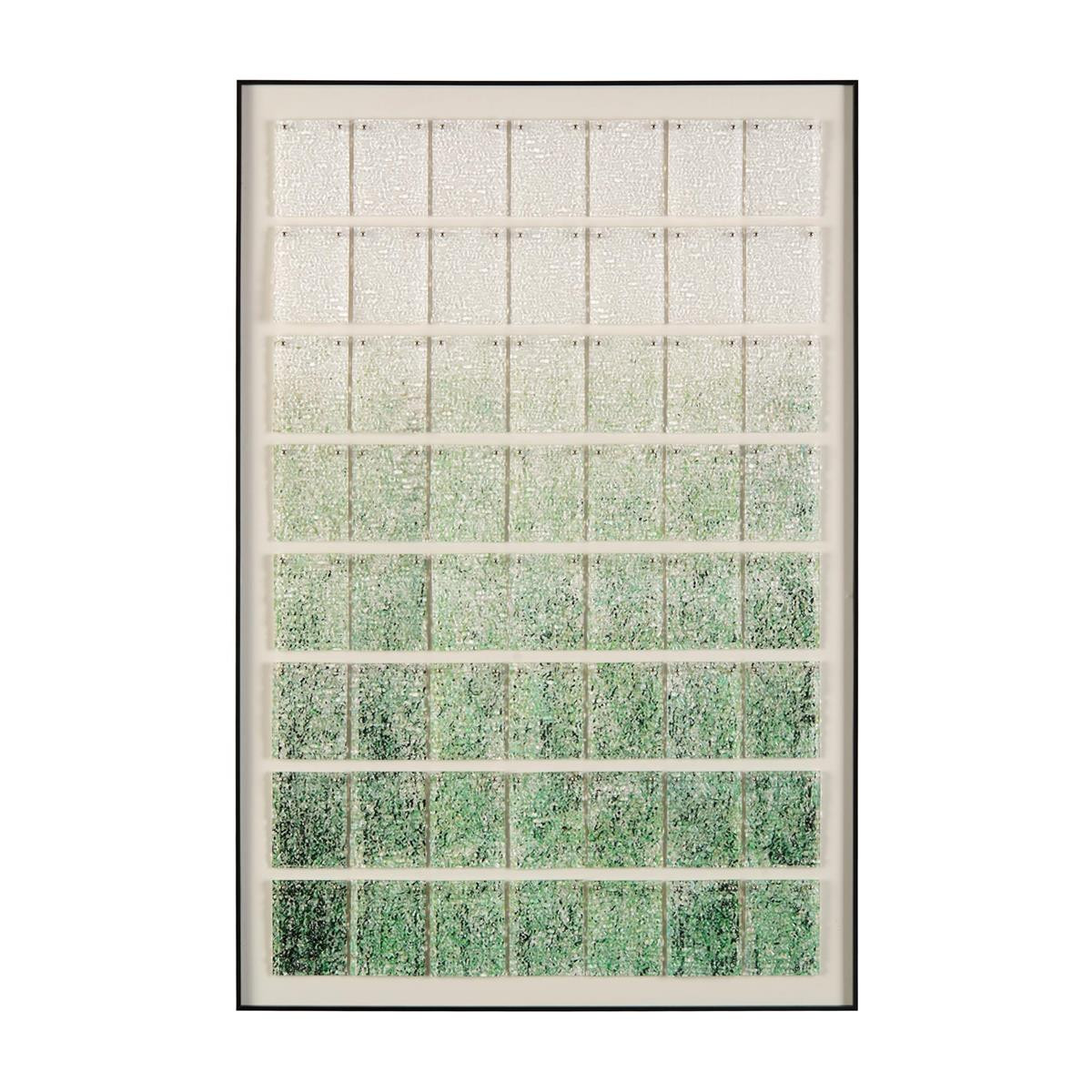 Enjoy the Tony Fey'S Harmonic Hues In Green in your home today! Cascading acrylic panels gradually fade from textured translucent white to emerald green shades in this original art by Tony Fey. It is mounted in a black metal frame *This item features acrylic parts. The crystal clear acrylic that John-Richard uses on some items is a wonderful decorative material. Over time, very fine scratch marks may appear on the surface of the acrylic through normal dusting and clea