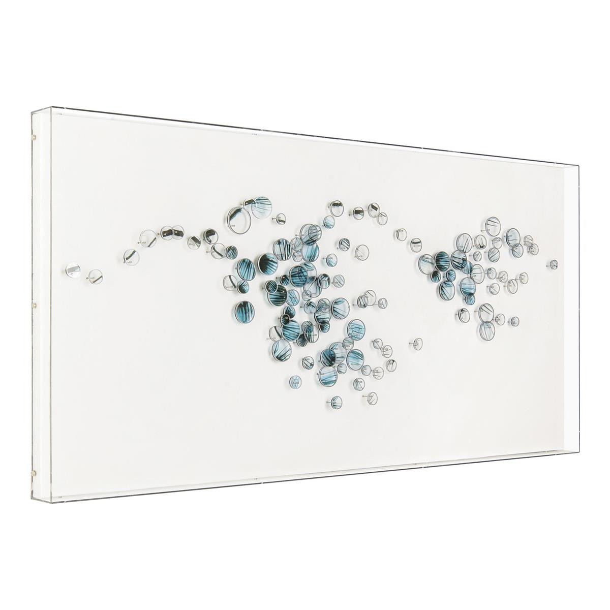 Enjoy the Tony Fey'S Raindrops in your home today! Acrylic disks with notes of blue recreate raindrops moving across a horizontal canvas. This original art is encased in an acrylic box.