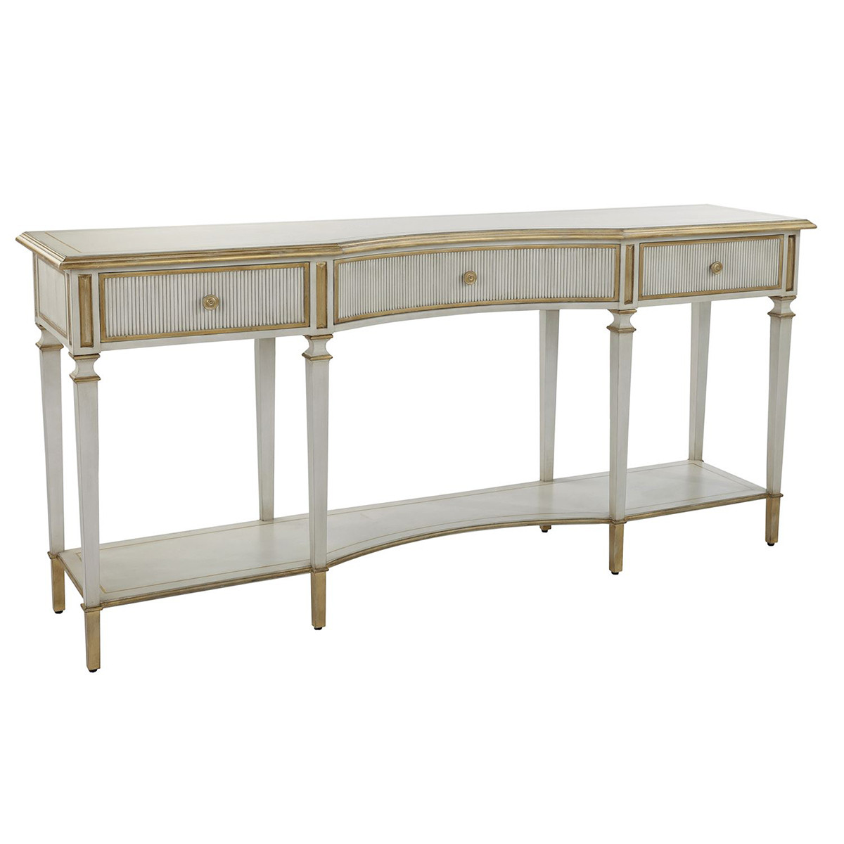 Enjoy the Vallejo Console Table in your home today! The Vallejo Console Table is a dignified piece that enhances any décor through opulent accents and intricate detailing. This beech wood piece showcases an Antique Beluga finish with detailing in Distressed Gold, along with matching brass handles adorning the three soft closing drawers. Ribbed molding and hand-carved, fluted legs complete the look of this stunning console table.