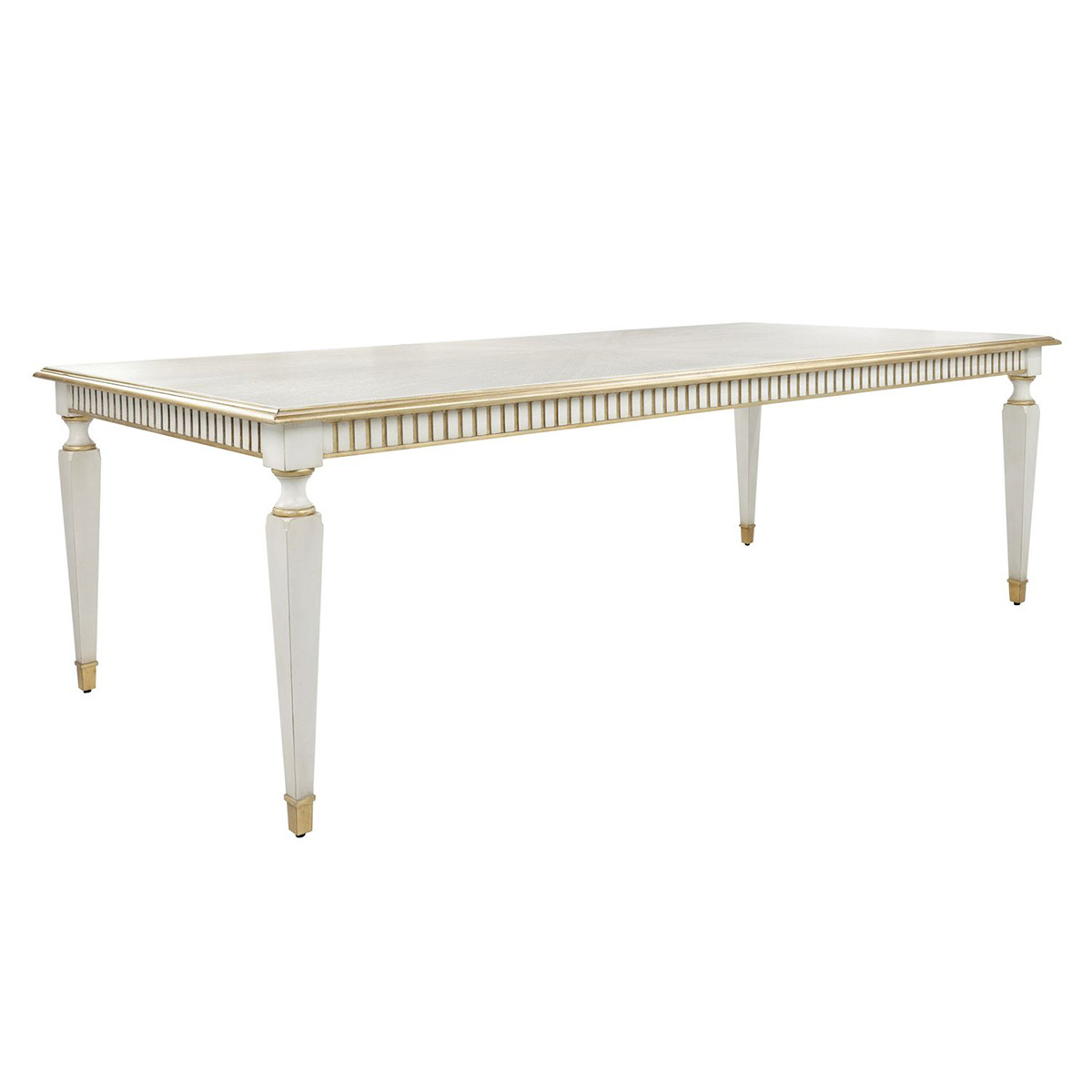 Enjoy the Vallejo Dining Table in your home today! The Vallejo Dining Table is a dignified piece that enhances any décor through opulent accents and intricate detailing. Crafted from a blend of beech and oak woods, the piece is adorned in an White Washed Oak finish with detailing in Distressed Gold. Four sophisticated legs with steel fittings communicate a sophisticated, architectural look that contributes depth and dimension to any interior space.