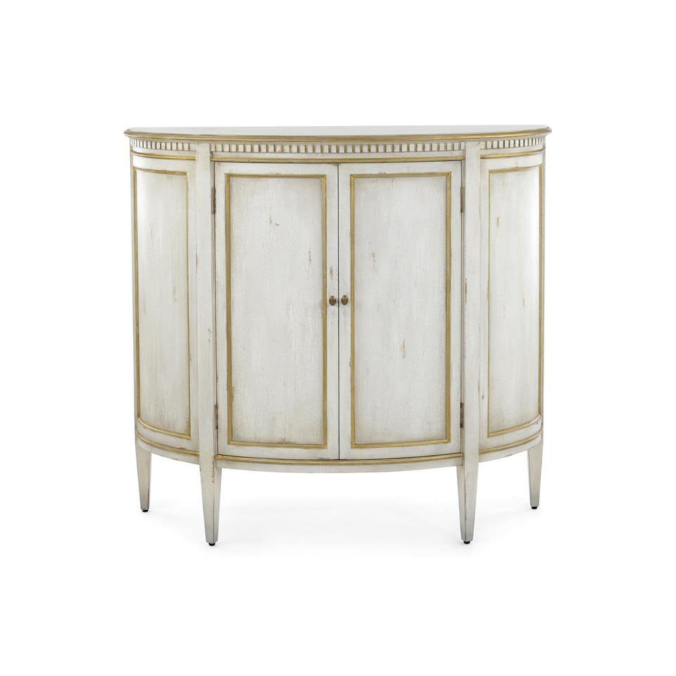 Enjoy the Volnay Demilune Cabinet in your home today! The Volnay is a demilune cabinet in the country style set on gently tapering legs. The finish is in distressed cream with gold detailing and an antique crackle effect. The case features dental molding under the ogee top. There are two paneled doors, each with a single antique brass knob and brass hinges. A single adjustable shelf completes the interior.