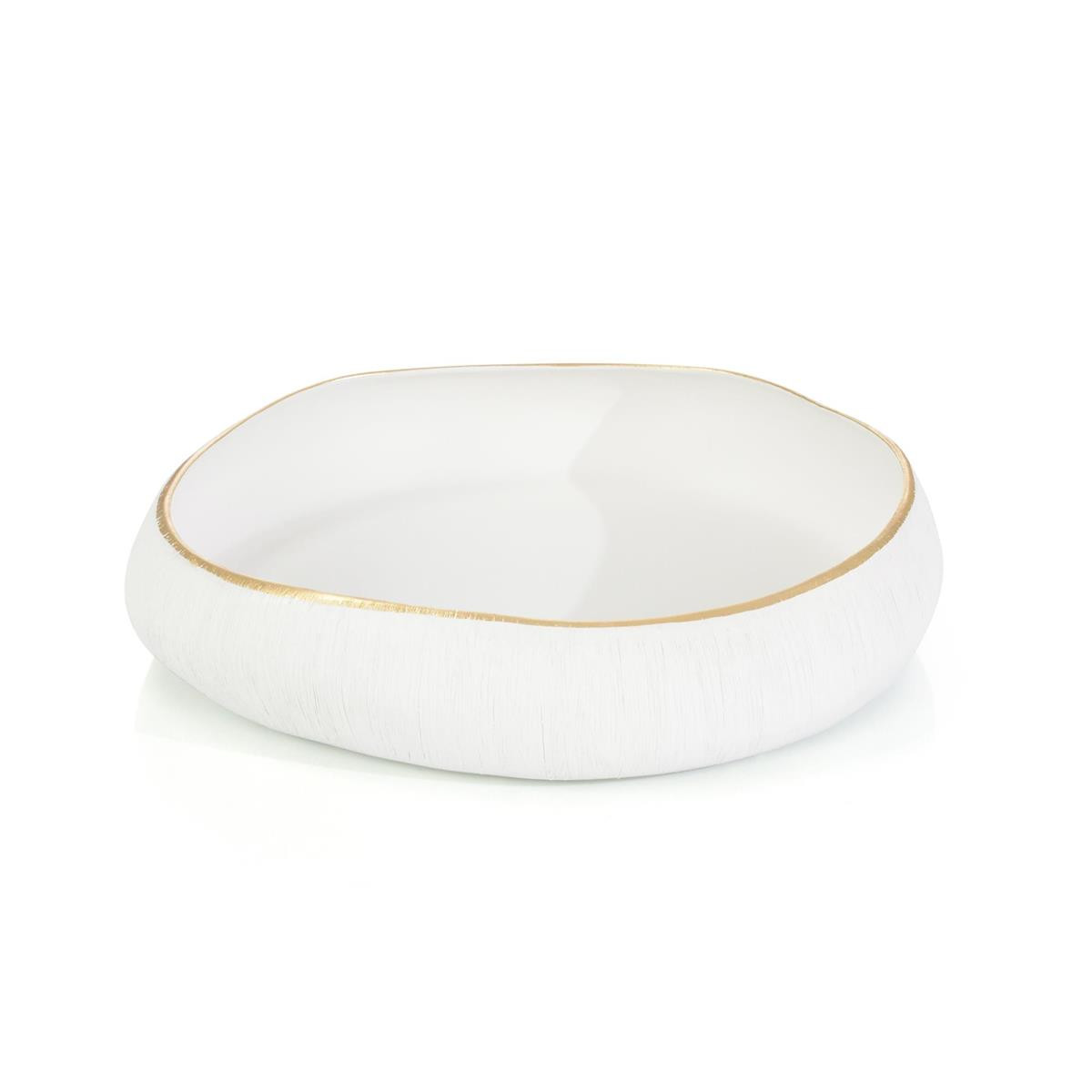 Enjoy the White Free-Form Bowl Ii in your home today! The lively, organic profile of this white ceramic bowl is equal parts playful and stylish. With a matte finish, the textural body and beautiful gold accent that adorns the rim are even more pronounced. This gorgeous accent can be placed by itself or paired with its larger twin to further enhance the look. *The glazing of ceramic & porcelain is an ancient process that is sensitive to the slightest variations in materials, application or even atmospheric conditions. The result is that variations in pattern and color will occur, and no two pieces will be ident