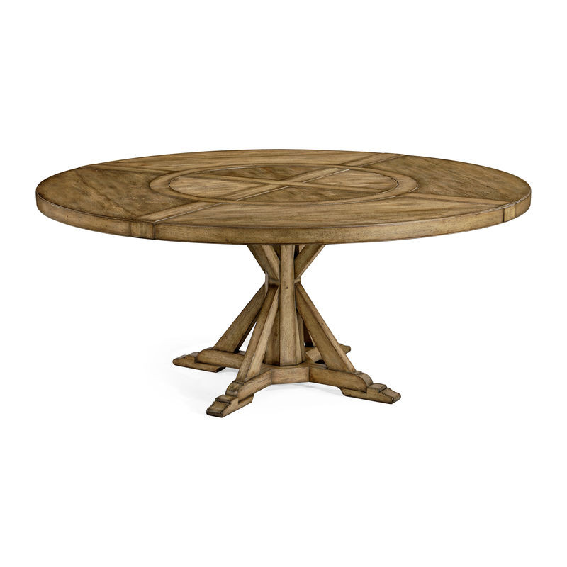 Enjoy the Casually Country Round 72" Solid Wood Dining Table in Medium Driftwood in your home today! 72" Solid medium brown driftwood topped circular dining table with a rustic finish showing exposed saw marks and set on a bracketed country kitchen base, the table containing an ingenious mechanism of a self-storing lazy susan within.