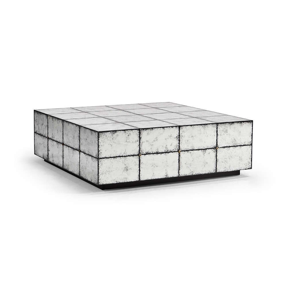 Enjoy the Luna Square Cocktail Table in your home today! With its exquisite materials, opulent details, and versatile design, the Luna Cocktail Table becomes a statement piece that seamlessly bridges the gap between classic elegance and captivating glamour. Crafted from hardwood solids and adorned with panels of antiqued eglomise glass on all sides, this table exudes an air of luxury and timeless beauty, while capturing light and reflecting a sense of refinement. The side panels of the table feature cast brass floral accents, adding a delicate yet impactful element of charm.