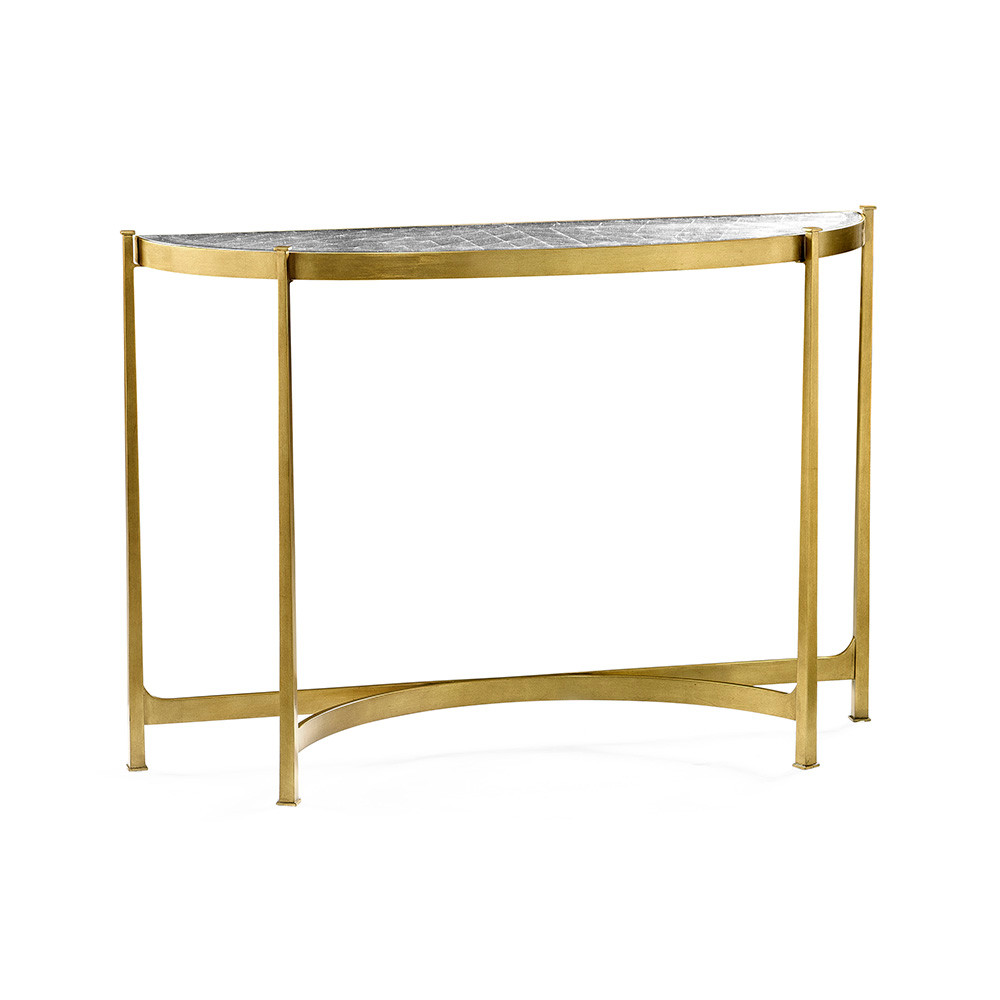 Enjoy the Luxe Large Half Moon Console Table in your home today! Contemporary wrought iron demilune console tables with an antique gilded finish and eglomise top.