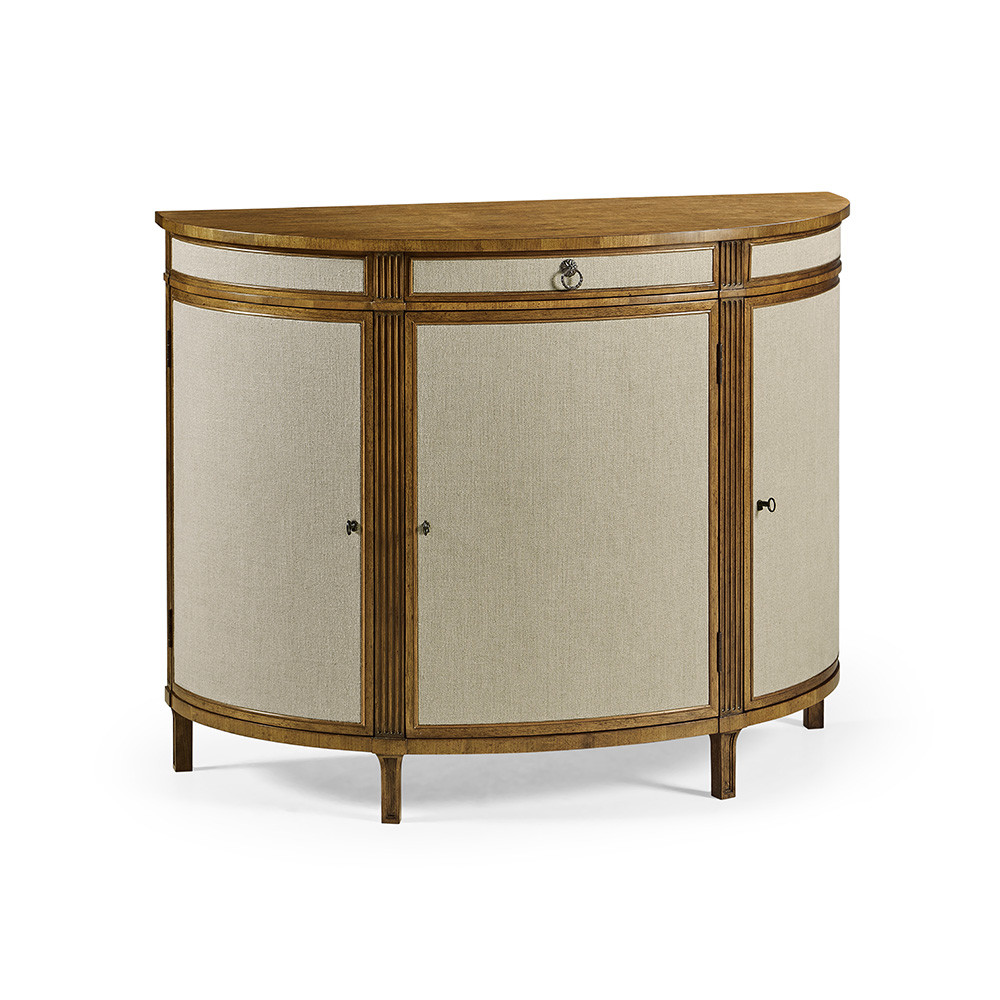 Enjoy the Reimagined Inductance Demilune in your home today! The Inductance Demi Lune from Jonathan Charles evokes the feeling of summers in the South of France and balmy rides in vintage convertibles. A solid case with Kravet Linen fabric cabinet doors and understated hardware is capped with a single drawer under a Grey Fruitwood top. Hovering a few inches above the floor on handsomely tapered feet with traditional accents, Inductance plays well with sophisticated spaces and vintage interiors.