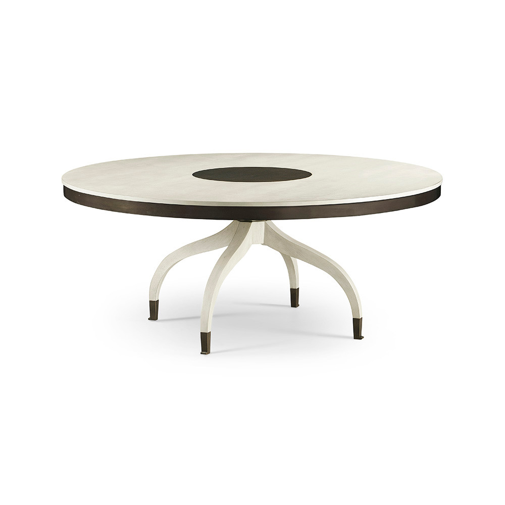 Enjoy the Reimagined Lodestone Round Dining Table in your home today! Effortlessly complementing formal and casual interiors alike, Jonathan Charles Lodestone Buckingham Dining Table boasts a round Oak top finished in tasteful Country White. Accented with a Zinc fixed Lazy Susan accent, apron and ferrules this table floats on four spider legs. Lodestone delivers sophistication and understated glam-perfect for foyers and dining spaces.