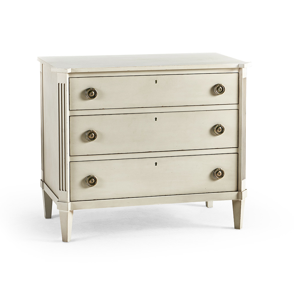 Enjoy the Timeless Aeon Swedish Drawer Chest in London Mist - Small in your home today! Designed to the highest degree of craftsmanship and attention to detail, Jonathan Charles Aeon drawer chest embodies Swedish country charm. Front columns featuring clean lines in a traditional style are offset at an angle between 3 drawers for a hint of contemporary design. Custom cast hardware in aged bronze compliments a painted grey finish in London Mist for an elegant worn look.
