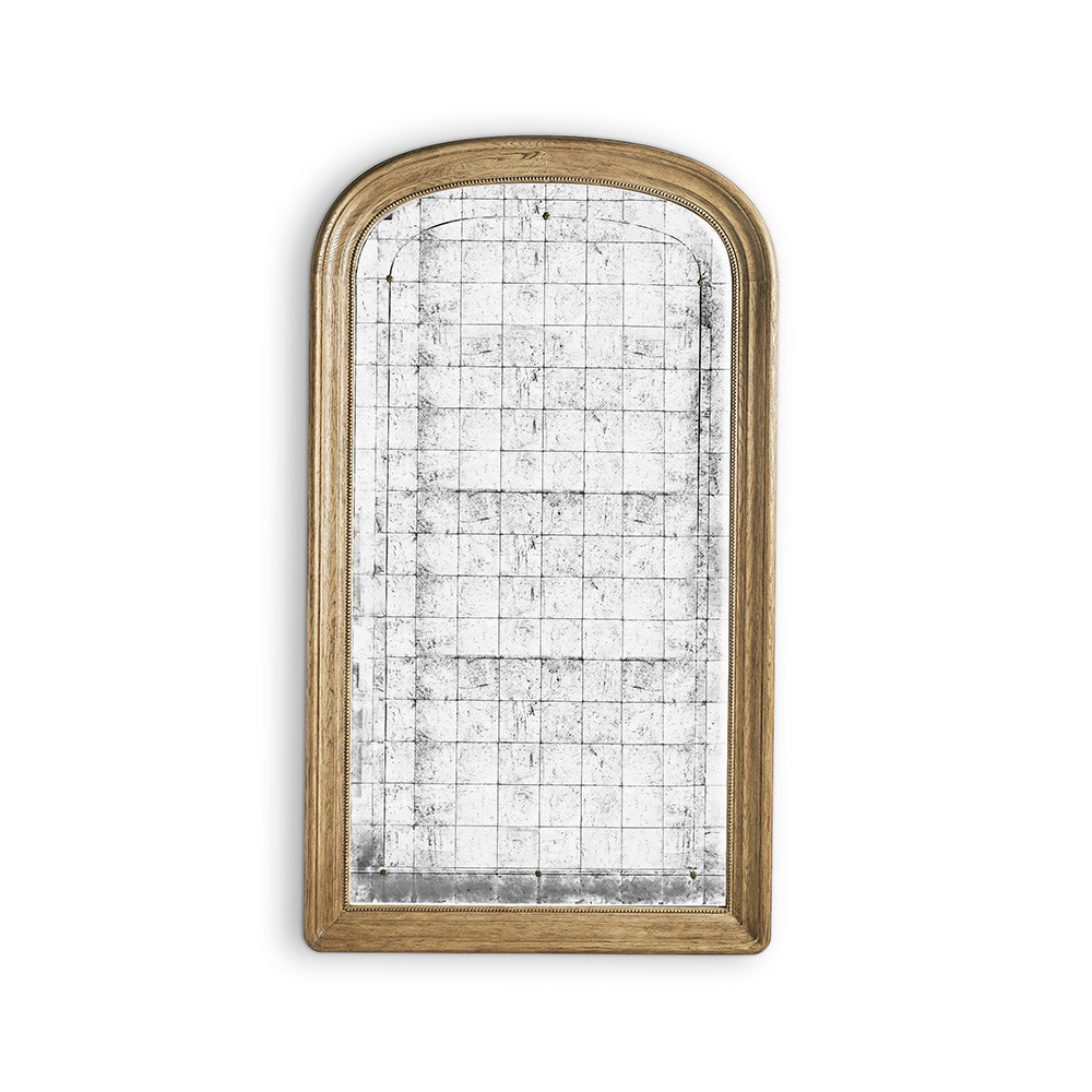 Enjoy the Timeless Lintel Floor Mirror in your home today! At first glance, the Lintel Floor Mirror appears as a portal to the mysterious imaginings of Old Lore. Encased in a natural Stripped Brown Chestnut frame, Lintels misty églomisé surface features a grid whose lines fade in and out of existence as they traverse from one side to the other. Towering over its subjects at 84 tall, Lintel is imposing and resplendent, demanding attention from every angle.