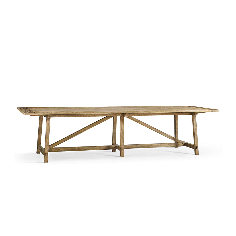Enjoy the Timeless Sidereal French Laundry Dining Table 125" in Chestnut in your home today! Jonathan Charles Sidereal French Laundry Dining Table is the perfect combination of unparalleled furniture craftsmanship, elegant functional solutions, and inspiring design. Powerful honed forms in stripped brown chestnut elicit a raw appreciation for natural materials and offer a unique experience of understated luxury. With the ability to extend up to 173 inches with removable leaves, Sidereal is one of our largest tables to date.