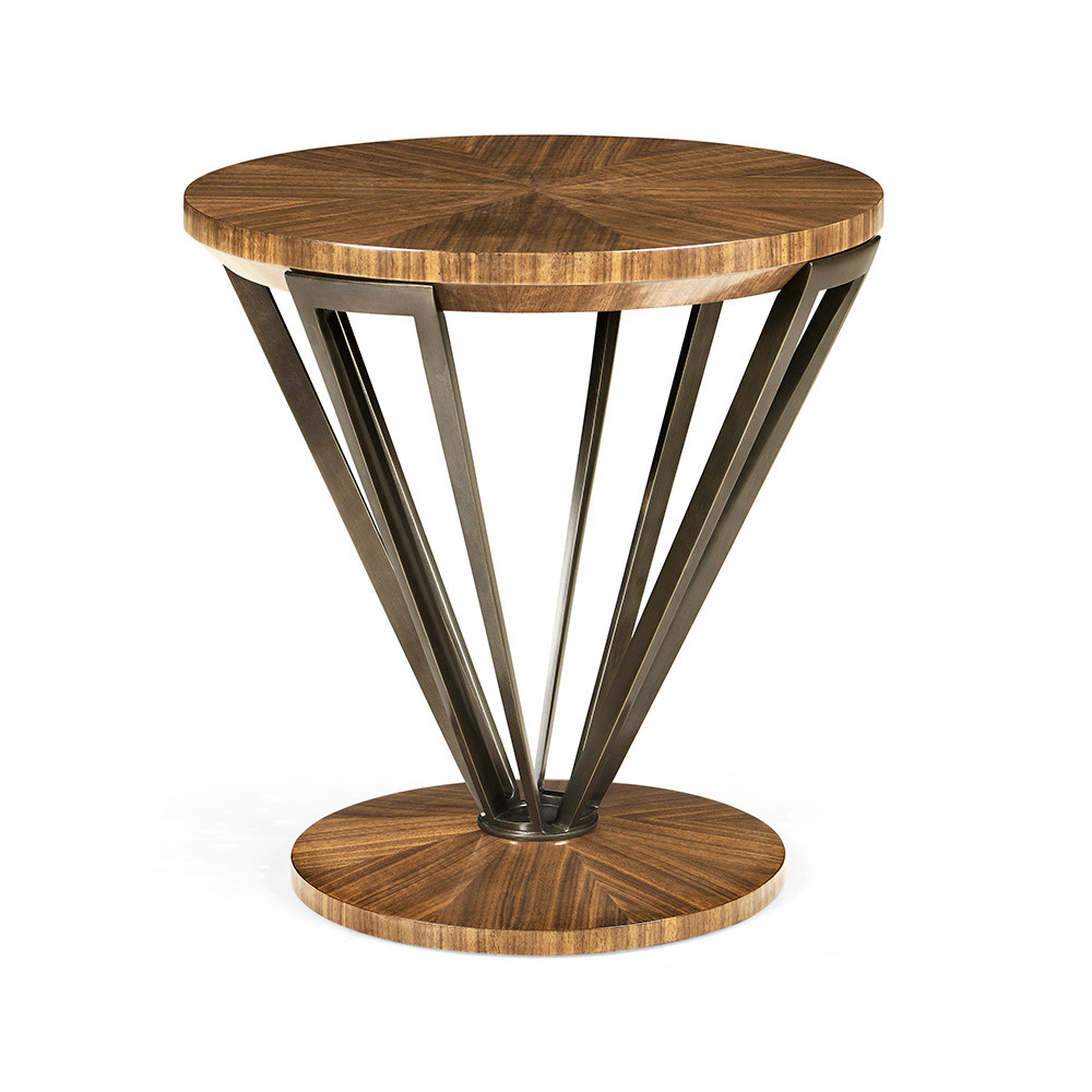 Enjoy the Toulouse Round Lamp Table in your home today! Inspired by the work of the French Modernists, this top features walnut radial slip match veneers under a transparent lacquer finish. Brass base is acid dipped and hand rubbed to achieve a rich, natural patina.