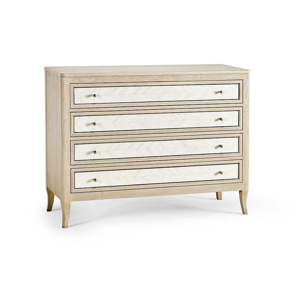 Enjoy the Water Berm Bachelors Chest in your home today! Subtle upgrades to timeless furniture design brings new aesthetic clarity to the Berm Bachelors Chest. Skillfully handcrafted by Jonathan Charles furniture artisans with chevron Bone Inlay drawer fronts accented with square custom cast Stainless Steel drawer moldings in Satin White Brass finish. Sitting atop gracefully tapered legs, Berm is a masterful blend of quality, design and function suitable for transitional and modern interiors.