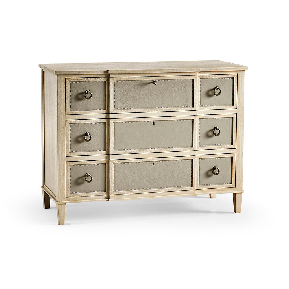 Enjoy the Water Neap Leather Front Chest in your home today! The Neap Leather Front Chest, with three hand-woven leather drawer fronts in Moore & Giles Hudson Smoke possesses richness, dimensionality and warmth made possible by an impressive display of furniture craftsmanship. Hardwood solids and veneers are enhanced with an exclusive Jonathon Charles Ash Blond finish and custom Cast Stainless Steel ring pulls in Satin White for a neutral and sophisticated aesthetic that compliments a range of refined stylings.