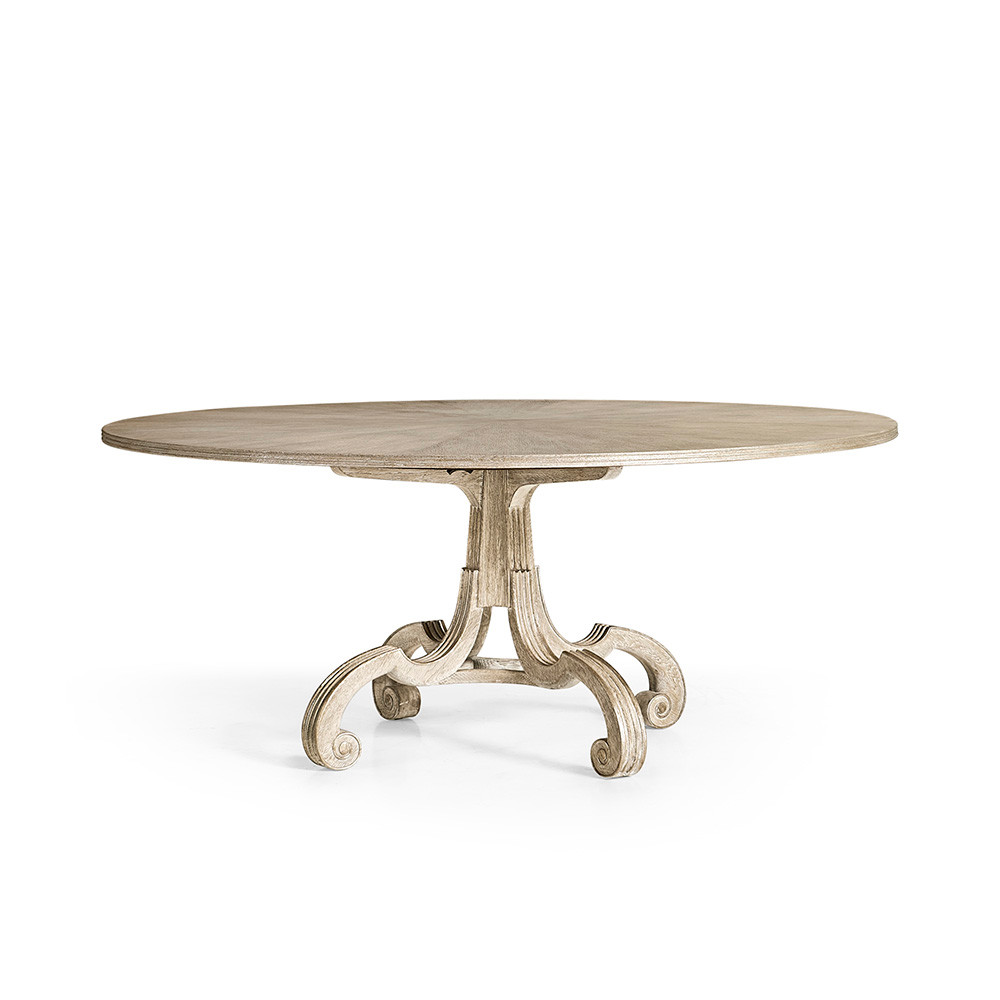 Enjoy the William Yeoward Lacock Table in Venetian White Oak in your home today! The Lacock dining table, which I have taken from a table with a small occasional base, happily seats ten. Its scroll foot and book-matched veneered top, finished in venetian white oak with silver gilding, makes it the enviable combination of smart and grand, but not traditional.