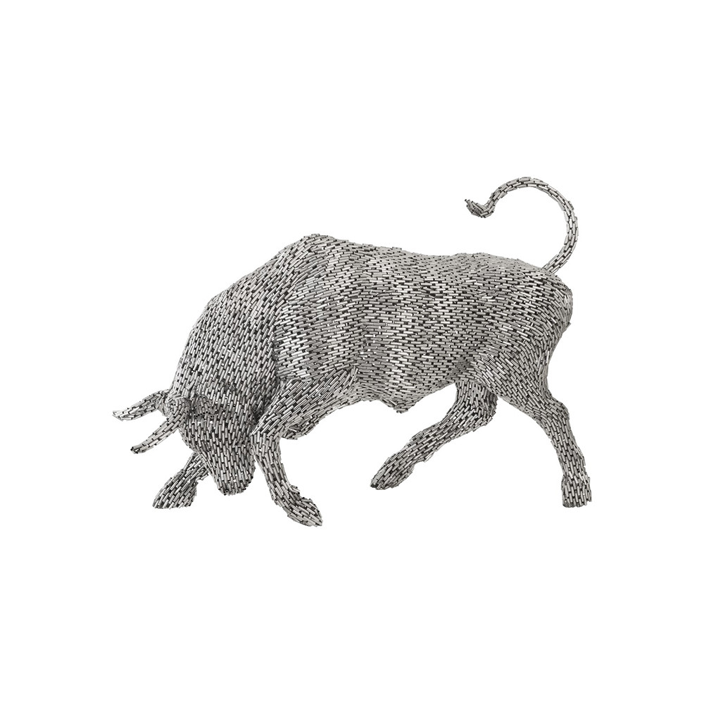 Enjoy the Bull Pipe Sculpture - Stainless Steel in your home today! A true testament to artistry, the Bull Pipe Sculpture illustrates how a talented artisan can take a brute material and bring it a sense of movement. With muscles rippling and tail flashing, the silver sculpture, which is made of stainless steel, achieves the sense of motion that convinces the senses that its nostrils are flaring. The mesh material that flows along the surface of this decorative accessory is textural in nature, which makes this metal sculpture perfect for a room that can benefit from a bit of an edge. This piece is the perfect representation of the Phillips Collection ethos: modern organic.
