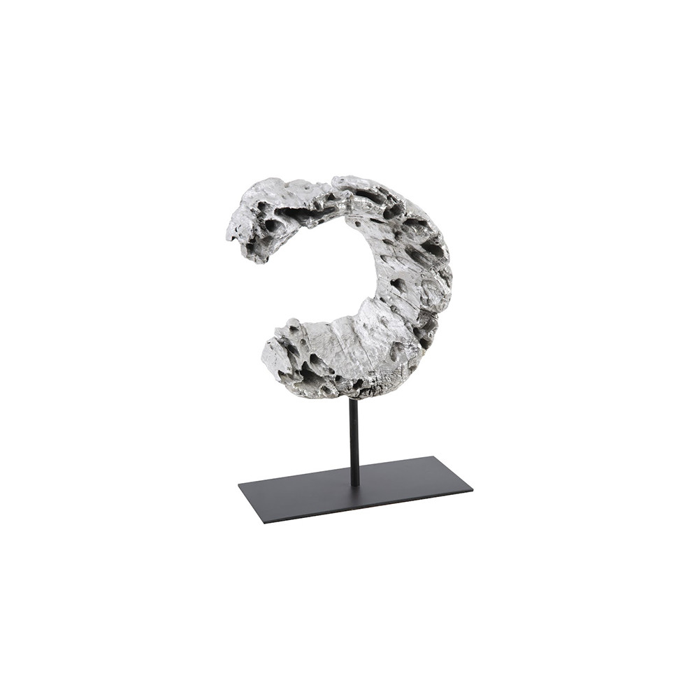 Enjoy the Cast Eroded Wood Circle on Stand in your home today! Bring an immediate sense of seriousness to a room with the Cast Eroded Wood Semi-Circle Sculpture. Though it is made of composite, it imitates a relic so convincingly, it could have been pulled from the smoky ruins of a bygone volcano. The mix of silver leaf and black finishes help amplify this ruse, which reflects the ethos that Phillips Collection personifies: modern organic. We offer a similar shape in this collection of table sculptures and several wall tiles, as well. Disclaimer: The silver leaf finish applied to our products is known for its luxurious metallic appearance. However, this finish can be susceptible to scratching if not handled carefully. Silver leaf is a delicate material; abrasions may occur during routine use or contact with abrasive surfaces. To maintain the pristine condition of your silver leaf-finished items, we strongly recommend using coasters or protective pads when placing objects on the surface. These coasters act as a safeguard, minimizing the risk of scratches and preserving the beauty of the silver leaf finish. While we strive to provide durable and high-quality finishes, it's important to acknowledge that any abrasive or sharp objects in contact with the surface may lead to unintentional damage. Therefore, please be careful and follow proper care guidelines to ensure the longevity of your silver leaf-finished products.