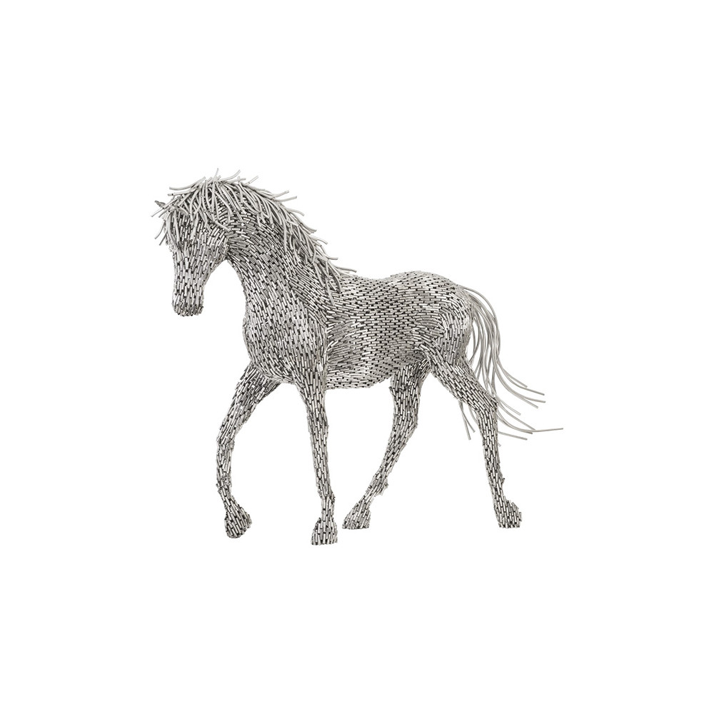Enjoy the Horse Pipe Sculpture - Walking - Stainless Steel in your home today! The Walking Horse Pipe Sculpture was envisioned by Timbul Raharjo, an award-winning artist and sculptor from the village of Kasongan in Yogyakarta, Indonesia. He is well-known for large-scale masterpieces like these decorative sculptures that are made from highly polished stainless-steel pipe that is individually placed and welded together to create astonishing, complex forms like mustangs and bulls. Timbul works with all types of metals, including aluminum castings, to make dresses, humans, and animals. Each piece is hand-sculpted and, after a thorough polish, the sculptures come to life convincingly. We also offer the horse in rearing and walking profiles in this family of sculptures. Each of these reflects the ethos that Phillips Collection personifies: modern organic.