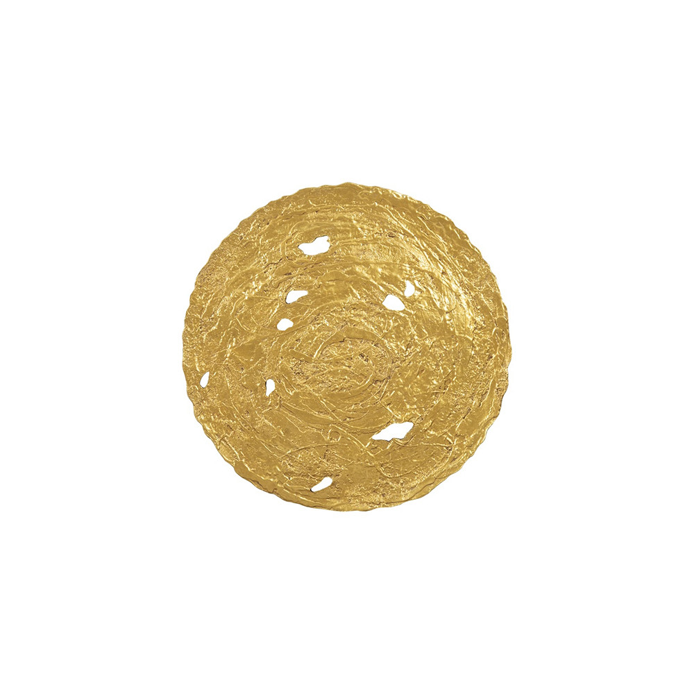 Enjoy the Molten Wall Disc - Large - Gold Leaf in your home today! Proving our design prowess in making other materials look like metal is the Molten Large Gold Wall Disc. It is made of composite to look as if hot metal was frozen as it was poured into its shape and covered in a bright gold leaf finish. The decorative wall disc is a design chameleon, as it would bring luminosity to any number of design styles, including contemporary, transitional, and traditional. Hang the large wall disc in a gallery wall installation with the medium and small decorative wall discs, for more impact. We also offer the Molten wall discs in a silver leaf finish. Each of these reflects the ethos that Phillips Collection personifies: modern organic. Disclaimer: The gold leaf finish applied to our products is known for its luxurious metallic appearance. However, this finish can be susceptible to scratching if not handled carefully. Gold leaf is a delicate material; abrasions may occur during routine use or contact with abrasive surfaces. To maintain the pristine condition of your gold leaf-finished items, we strongly recommend using coasters or protective pads when placing objects on the surface. These coasters act as a safeguard, minimizing the risk of scratches and preserving the beauty of the gold leaf finish. While we strive to provide durable and high-quality finishes, it's important to acknowledge that any abrasive or sharp objects in contact with the surface may lead to unintentional damage. Therefore, please be careful and follow proper care guidelines to ensure the longevity of your gold leaf-finished products.