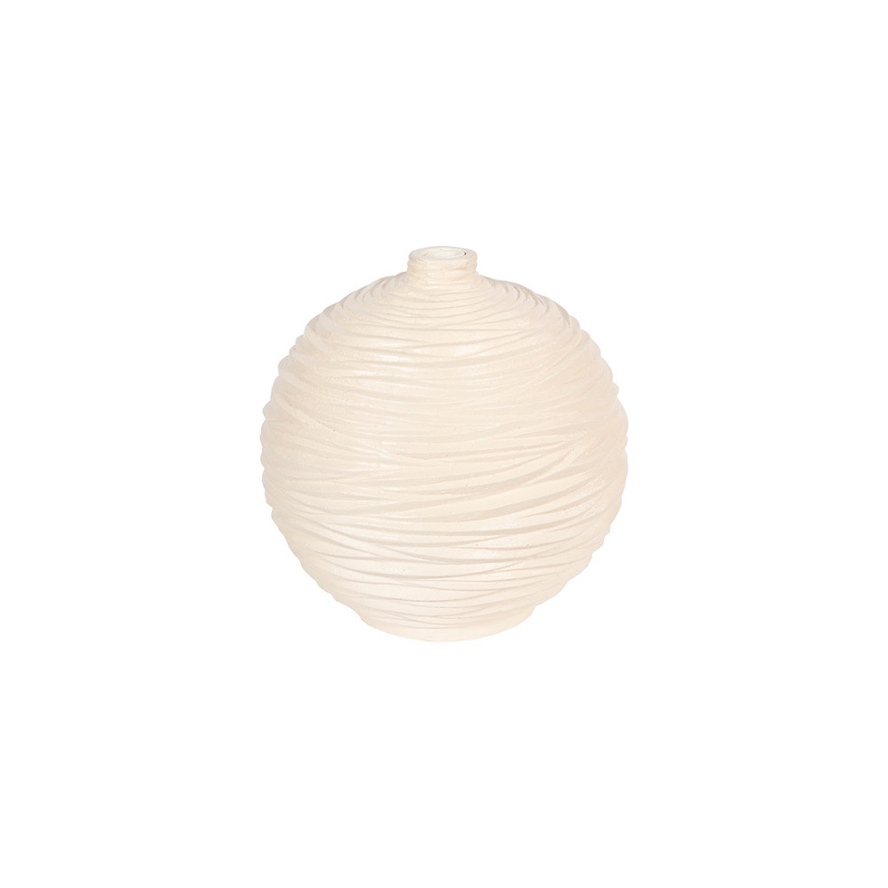 Enjoy the Waves Sphere Vase in your home today! The design of the Waves Sphere Vase was inspired by the rippling patterns the wind creates on sand. Each of the pieces in our Waves family of products combines organic inspiration with high technology. Because these vases are made of composite, they are long-lasting, lightweight, and durable. The fact that the off-white vase takes on the spirit of stone, it illustrates how contemporary materials can feel natural. This circular vase definitively reflects the Phillips Collection ethos of modern organic. Disclaimer: The Stone Cast Finish is composed of real crushed stone mixed with resin. This finish is suitable for outdoor and indoor use and has a rough texture like real stone.