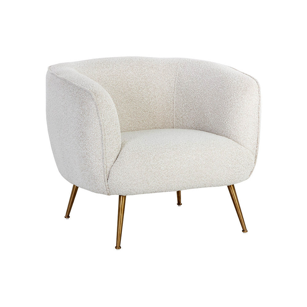 Enjoy the Amara Lounge Chair - Copenhagen White in your home today! A charming lounge chair designed with a bold, curved frame. Upholstered in copenhagen white boucle fabric. Tapered stainless steel legs in a gold finish complete the look. Perfect for contemporary and modern environments.