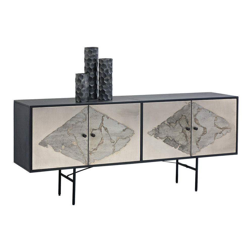 Enjoy the Arlington Sideboard - Large in your home today! Make a bold statement with this unique sideboard. Cabinets feature a one-of-a-kind patina finish, boldly contrasted with a black iron frame. Made in India. With refined craftsmanship, this design was brought to life by skilled local artisans. By nature, these materials develop unique imperfections such as markings and colour variations for a truly one-of-a-kind piece. Pictures shown reflect the lightest and darkest variations of our Arlington patina finish. Actual product may range between these finishes.