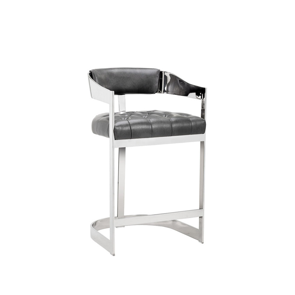 Enjoy the Beaumont Counter Stool - Stainless Steel - Cantina Magnetite in your home today! This ultra contemporary stool features a T-shaped back, tapered arms and an antique brass crown base. Stocked in cantina magnetite bonded leather. Perfectly suited for commercial and residential settings. Suitable for various dining, kitchen and bar spaces of all sizes. Handle with Care: This design has been crafted with bonded leather. Bonded leather is a blend of reconstituted leather and synthetic materials crafted to reflect the natural characteristics of leather; as such, colour variations, markings, wrinkles, grooves and light scratches are acceptable and appreciated characteristics. No two pieces are alike. Visit our Product Care page for more information on how to ensure the lasting beauty of this piece.