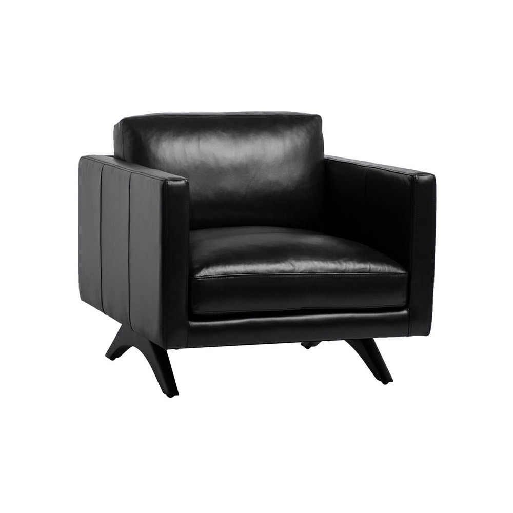 Enjoy the Rogers Armchair - Cortina Black Leather in your home today! A stylish, retro-inspired armchair. The masculine design features a comfortable seat in cortina black leather with dark brown solid oak wood legs. Coordinating sofa also available. Handle with Care: This design has been crafted with 100% genuine leather. Leather is a natural material; as such, colour variations, markings, wrinkles, grooves and light scratches are acceptable and appreciated characteristics. No two pieces are alike. Visit our Product Care page for more information on how to ensure the lasting beauty of this piece.